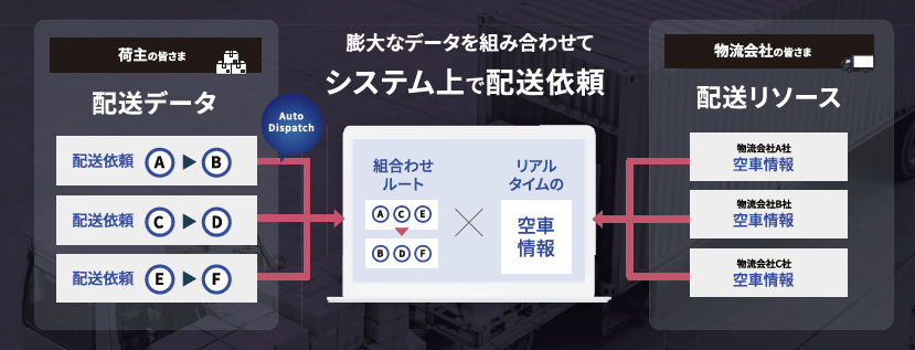 複数荷主の荷物と複数運送会社から提出された大量データを自動で組み合わせるサーピス