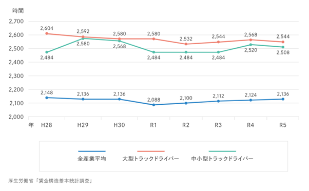 トラックドライバーの労働時間は、他業種と比較すると長時間にわたります。2023年の年間労働時間を見ると、全産業の平均2,136時間に対して、トラックドライバーは2,500時間を超えています。