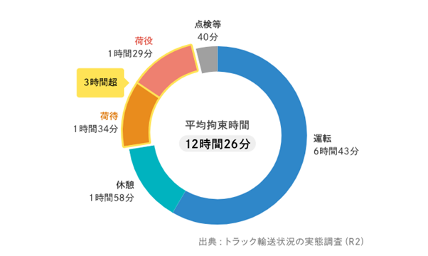 1日の拘束時間についても平均12時間を超えており、運転以外にも荷物の積み下ろしで負担がかかっています。