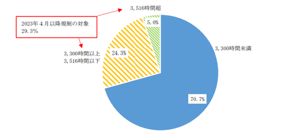 2021年時点におけるデータを見ると、改善基準告示の改正で規定された3,300時間を超える拘束時間で働くドライバーが全体の3割程度を占めています。