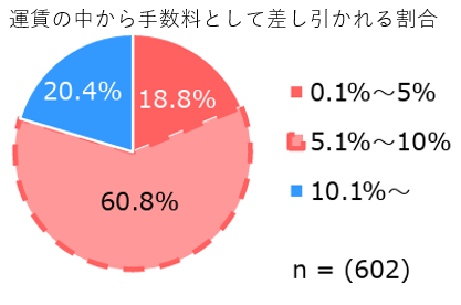 多重下請け構造は、国内輸送網の維持という大きな課題に直結している原因の1つです。 ※1 国土交通省の調査(令和7年6月)によると、運送事業者が収受した報酬から下請依頼時に以下の手数料を差し引いている実態が明らかとなりました。さらに同調査では、66.0%の運送事業者が下請先に手数料を明示していないことも併せて判明。