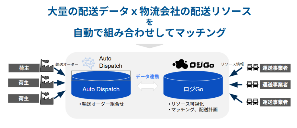 また、荷主のもつ大量の荷物データと、運送会社のもつ運行データを一度に処理することができる配車ロジックであるAuto Dispatchを、ロジGoと併せて利活用することで現状のマッチングプラットフォームが持つ課題をクリアできる可能性があります。
