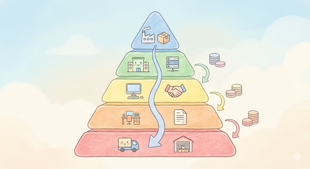 「多重下請け構造」とは、荷主から業務を受託した元請け事業者が、自社のリソースで対応しきれない分を下請け事業者へ、その下請けがさらに孫請け、そのさらに下請へと業務を再委託(外注)することで形成される、多層的なピラミッド型の産業構造を指します。