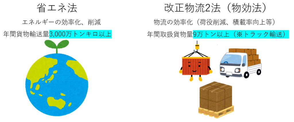 - ポイント: 「物効法」の基準(9万トン)と「省エネ法」の基準(3,000万トンキロ)は異なります。両方に該当する大企業もあれば、片方だけ該当する企業もあります。